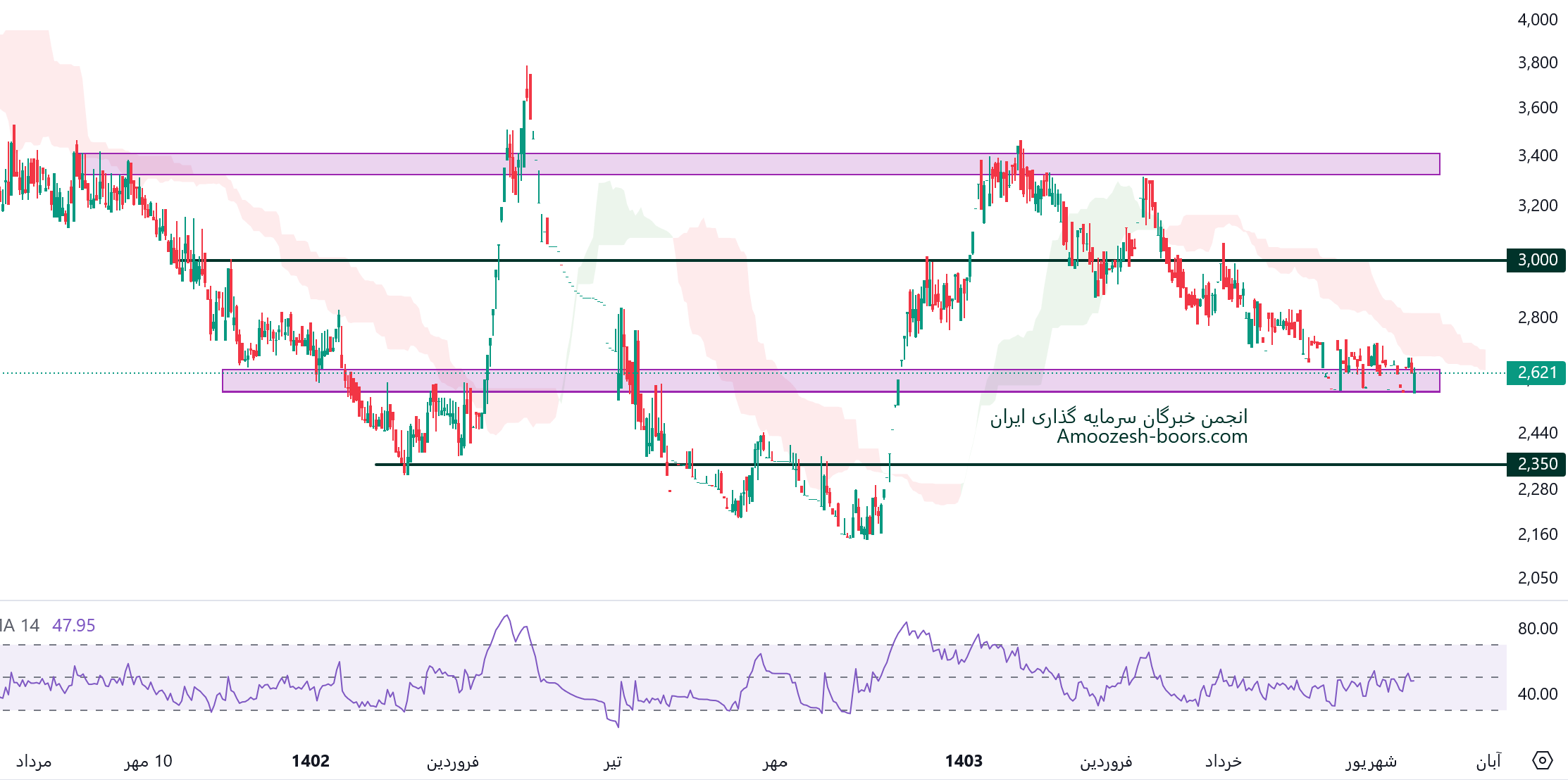 حمایت اتکام 2800 ریال: این سطح بهعنوان یک نقطه حیاتی برای جلوگیری از اصلاح بیشتر قیمت عمل میکند، اگر قیمت به زیر این سطح نفوذ کند، انتظار میرود که حمایت بعدی در محدوده 2100 ریال قرار داشته باشد.