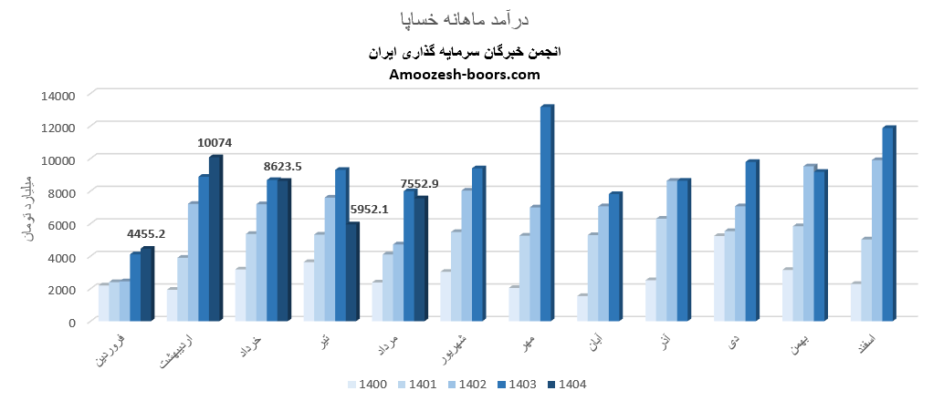 گزارش فعالیت ماهانه نماد خساپا در خرداد ماه سال 1404 نشان میدهد که این شرکت در این بازه زمانی توانسته است به درآمد 8623.5 میلیارد تومان دست یابد، این رقم نسبت به ماه مشابه سال گذشته 1 درصد کاهش داشته است؛ همچنین در مقایسه با ماه گذشته و متوسط ماهانه به ترتیب تغییر 14- و +19درصد داشته است.