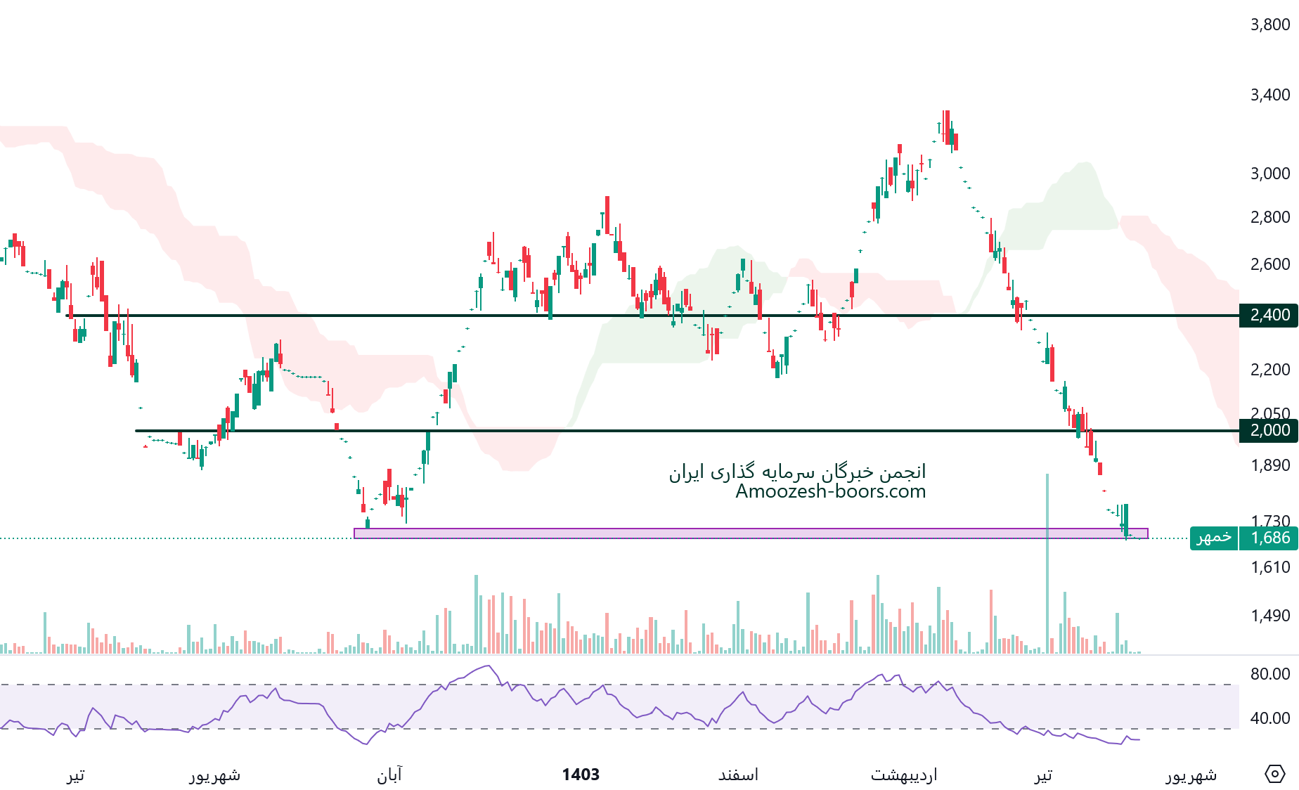 طبق نمودار قیمتی، حمایت مهم خمهر در محدودهی 170 تومان قرار دارد، این سطح قبل از این چندین بار بهعنوان ناحیه برگشتی عمل کرده و واکنش قیمت به آن قابل توجه بوده است، از سوی دیگر، محدودهی 200 تومان بهعنوان مقاومت مهم خمهر در نظر گرفته میشود که قیمت سهم در برخورد با آن دچار فشار فروش شده است.