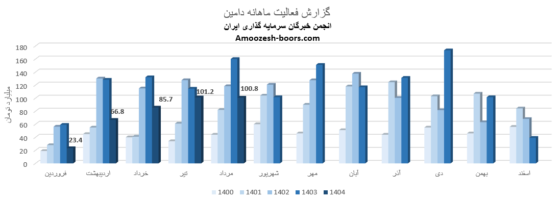گزارش فعالیت ماهانه نماد دامین در خرداد ماه سال 1404 نشان میدهد که این شرکت در این بازه زمانی توانسته است به درآمد 85.7 میلیارد تومان دست یابد، این رقم نسبت به ماه مشابه سال گذشته 35 درصد کاهش داشته است؛ همچنین در مقایسه با ماه گذشته و متوسط ماهانه به ترتیب تغییر 28+ و 27- درصد داشته است.