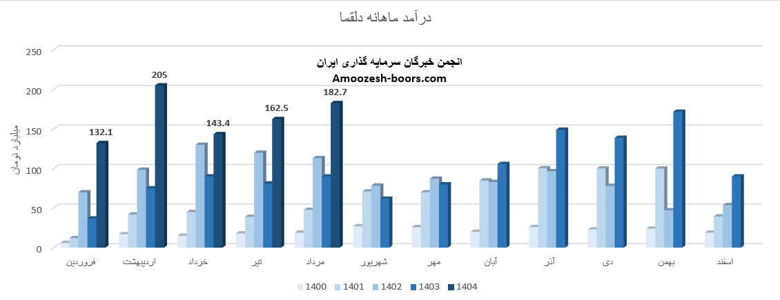 سهام دلقما از ابتدای سال مالی تا پایان مرداد 1404، مجموع درآمد ثبت شده شرکت به 826 میلیارد تومان رسیده که نسبت به مدت مشابه سال گذشته 121 درصد رشد داشته، و در همین حال 71 درصد از کل درآمد سال گذشته تحقق یافته است.