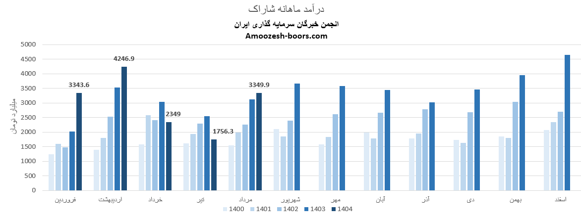 گزارش فعالیت ماهانه نماد شاراک در خرداد ماه سال 1404 نشان میدهد که این شرکت در این بازه زمانی توانسته است به درآمد 2349 میلیارد تومان دست یابد، این رقم نسبت به ماه مشابه سال گذشته 23 درصد کاهش داشته است؛ همچنین در مقایسه با ماه گذشته و متوسط ماهانه به ترتیب تغییر 45- و 38- درصد داشته است.