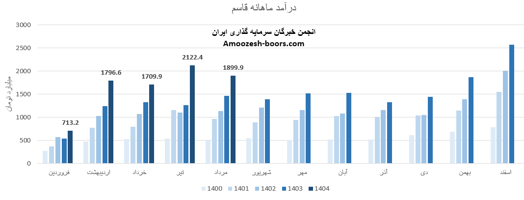 گزارش فعالیت ماهانه نماد قاسم در خرداد ماه سال 1404 نشان میدهد که این شرکت در این بازه زمانی توانسته است به درآمد 1710 میلیارد تومان دست یابد، این رقم نسبت به ماه مشابه سال گذشته 29 درصد افزایش داشته است؛ همچنین در مقایسه با ماه گذشته و متوسط ماهانه به ترتیب تغییر 5- و 36+ درصد داشته است.