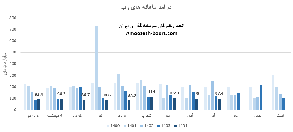 سهام های وب از ابتدای سال مالی تا پایان آذر 1404، به درآمد 853 میلیارد تومان رسیده که نسبت به مدت مشابه سال گذشته 26 درصد افت داشته، و در همین حال 52% درصد از کل درآمد سال گذشته تحقق یافته است.