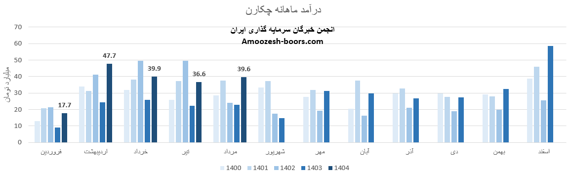 سهام چکارن از ابتدای سال مالی تا پایان مرداد 1404، مجموع درآمد ثبت شده شرکت به 182 میلیارد تومان رسیده که نسبت به مدت مشابه سال گذشته 73 درصد رشد داشته، و در همین حال 56 درصد از کل درآمد سال گذشته تحقق یافته است.