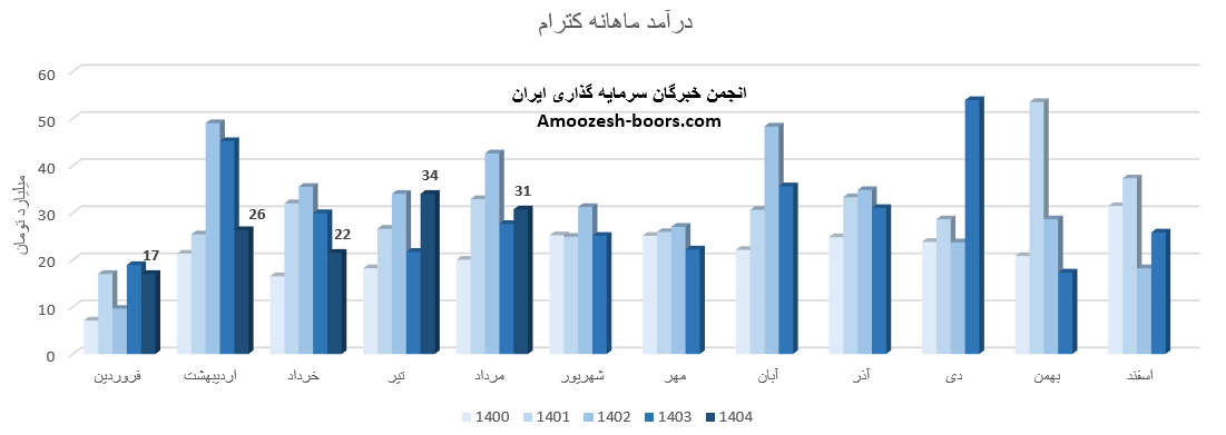 سهام کترام از ابتدای سال مالی تا پایان مرداد 1404، مجموع درآمد ثبت شده شرکت به 129 میلیارد تومان رسیده که نسبت به مدت مشابه سال گذشته 10 درصد افت داشته، و در همین حال 37 درصد از کل درآمد سال گذشته تحقق یافته است.