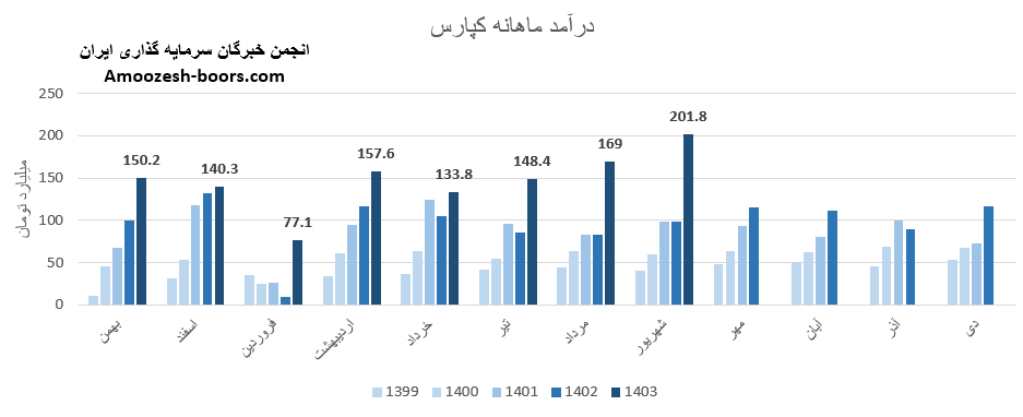 سهام کپارس از ابتدای سال مالی تا پایان شهریور 1404، به درآمد 1178 میلیارد تومان رسیده که نسبت به مدت مشابه سال گذشته 62 درصد رشد داشته، و در همین حال 1 بیشتر درصد از کل درآمد سال گذشته تحقق یافته است.