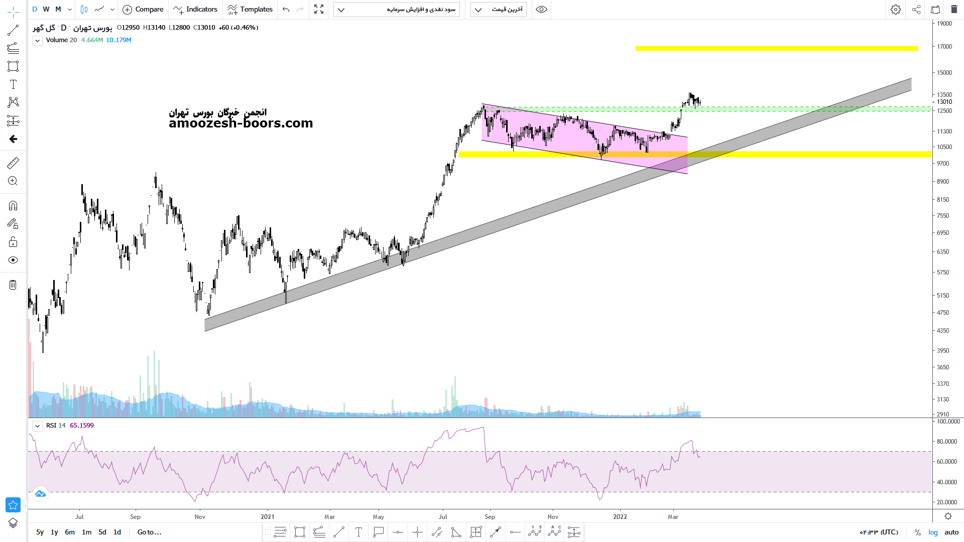 قیمت پس از تصویب افزایش سرمایه شرکت و بازگشایی نماد با ۷ % رشد در روز بازگشایی توانست از کانال نزولی خود خارج شده و اکنون باید به دنبال تثبیت بر روی مقاومت شکسته شده باشد انتظار میرود با برخورد به مقاومت محدوده ۱۳۰۰ تومان پولبکی را به این ناحیه آغاز کرده سپس پس از تایید پولبک به رشد خود ادامه دهد اما در صورت بروز واکنش منفی به محدوده مقاومتی هزار و ۳۰۰ تومان روند خنثی را در یک کانالی برای سهم متصور می شویم تا بین محدوده د 1000 و ۱۳۰۰ تومان نوسان خود را ادامه دهد.
